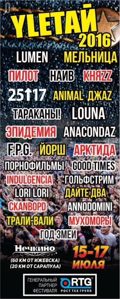Участники летнего «YLETAЙ!-2016» группы Lumen, Louna, Мельница, Пилот, Наив, 25/17, Animal Джаz,Anacondaz, F.P.G., Эпидемия, Тараканы, Княzz, Йорш, Порнофильмы, Арктида, Дайте Два, Good times, Гольфстрим, Anodomini, Lori Lori, Индульгенция, Мухоморы, Трали-вали, Ска'n'ворд и другие.