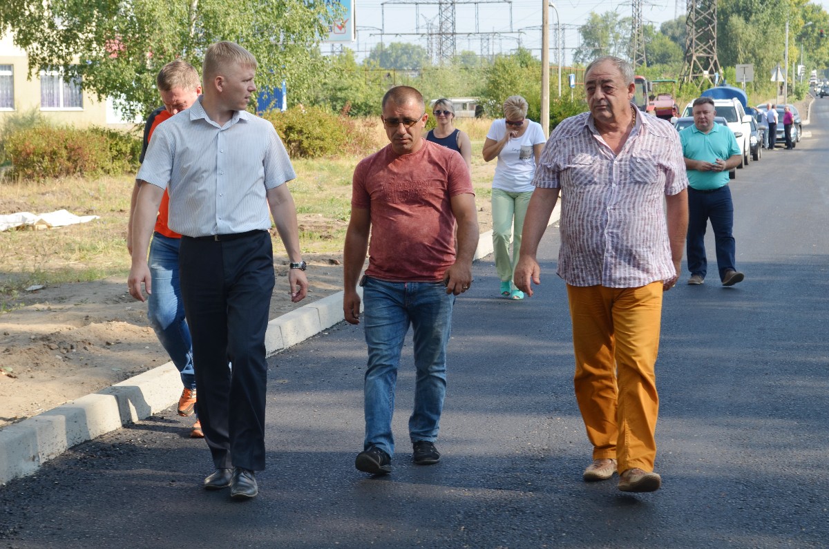 Последним пунктом проверки стала улица Советская, где полным ходом идут работы по укладке асфальтобетонного покрытия. Сейчас эти работы завершены более чем на 60 %.