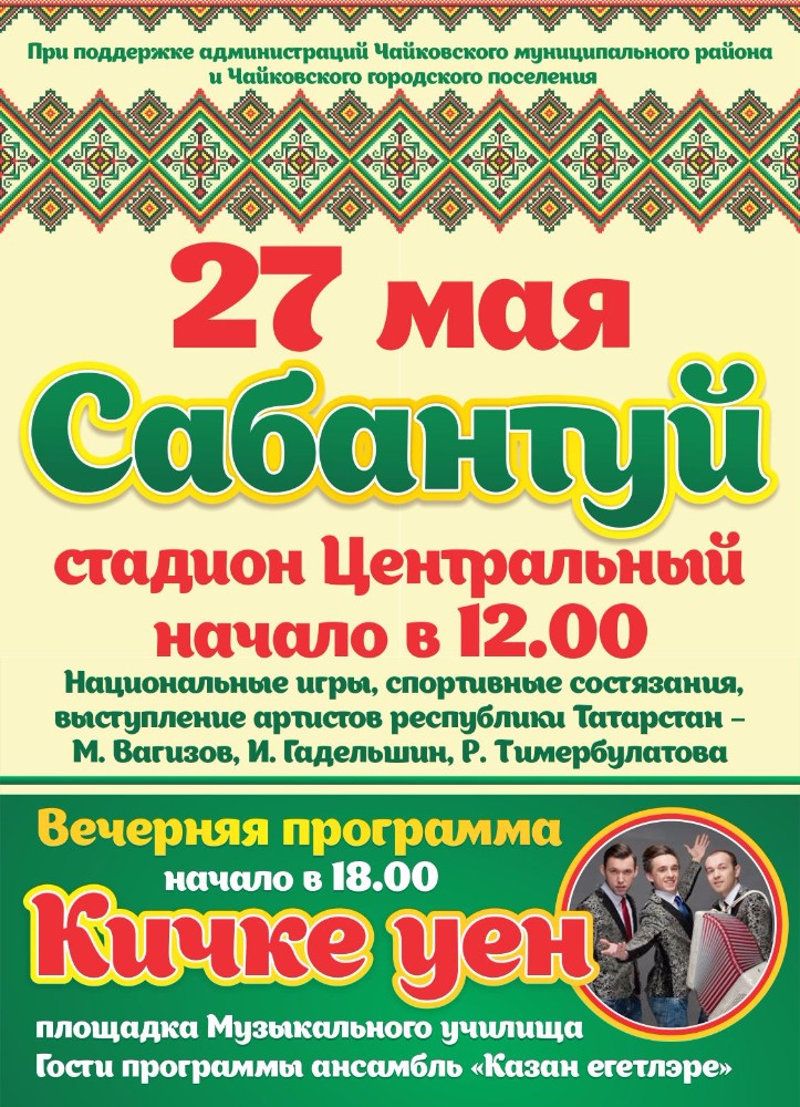 В полдень 27 мая на стадионе «Центральный» состоится традиционный праздник тюркоязычных народов «Сабантуй». Всех гостей вновь ждут вкусная выпечка, напитки, весёлые спортивные конкурсы, состязания и национальные игры для детей и взрослых, национальная борьба «Куреш». Концертная программа пройдёт с участием ансамбля «Сайлян», фольклорного ансамбля «Идель», детского ансамбля «Йолдызлар» и приглашённых артистов из республики Татарстан (М.Вагизов, И.Гадельшин, Р.Тимербулатова).