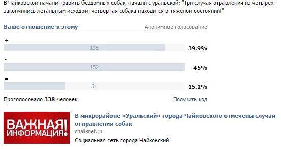 Все это привело лишь к тому, что в микрорайоне «Уральский» обосновалась наиболее крупная свора собак. По сведениям очевидцев, только в последнюю неделю ею был совершен ряд нападений на жителей города. Устав от отсутствия со стороны властей каких-либо действенных мер, некоторые граждане решили самостоятельно бороться с бродячими животными. Так вчера, по данным чайковской районной общественной организации помощи бездомным животным «Ищу человека» были зафиксированы случаи отравления собак.