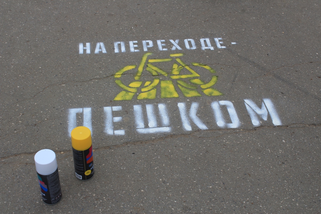 Участники мероприятия выбрали тротуары вблизи пешеходных переходов, расположенных на центральных улицах города. При помощи трафарета и краски, нанесли надписи «На переходе – пешком!», с призывом к велосипедистам правильно пересекать проезжую часть на велосипеде, а именно спешиться и идти по пешеходному переходу пешком.