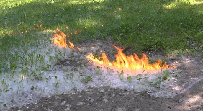 Он скапливается во дворах, возле строений, стоянок автотранспорта и в одночасье возгорание тополиного пуха может добраться до зданий и сооружений.