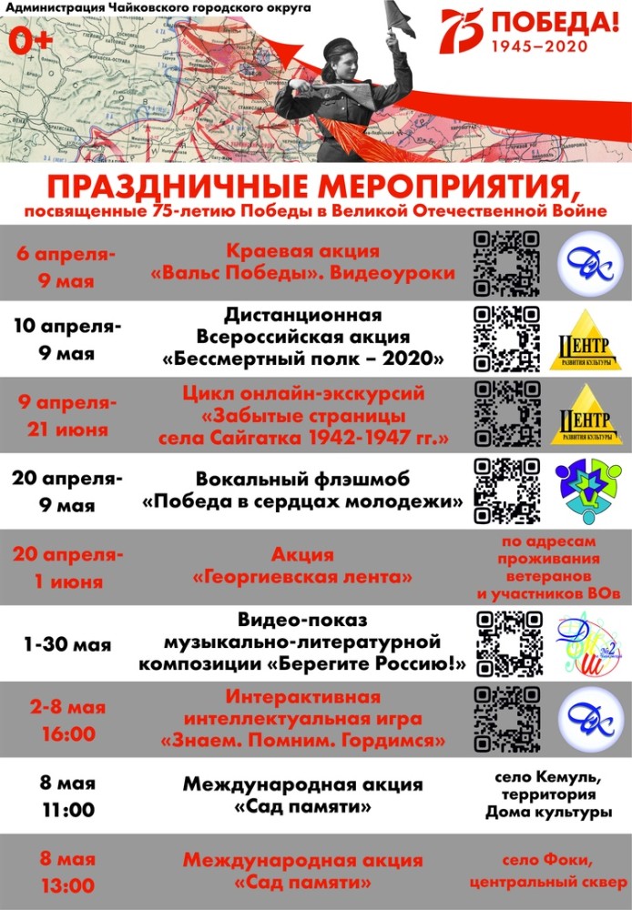 Отметим, всего в Пермском крае состоится свыше 5600 мероприятий, посвящённых 75-ой годовщине Победы. Среди них – онлайн-трансляции, уникальные виртуальные выставочные проекты, телевизионный марафон, акции памяти, премьера фильма. К 9 мая учреждения культуры региона подготовят более 100 онлайн-событий.
