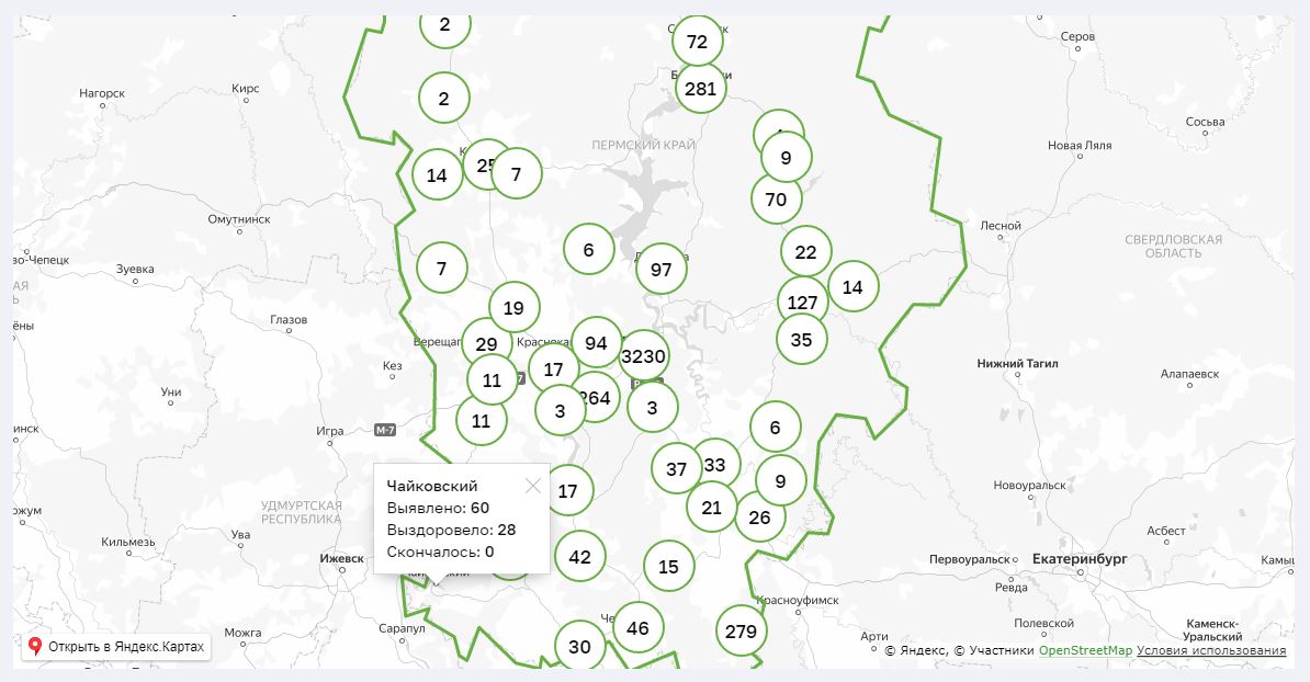 Общее число инфицированных в Пермском крае достигло 5142. Ежесуточный прирост больных составил 1,7% – этот показатель позволяет отследить динамику распространения инфекции в регионе. Коэффициент распространения болезни на сегодня составляет 1,03 (на 20 июля – 1,2). С картой распространения коронавируса в Пермском крае можно ознакомиться ниже.