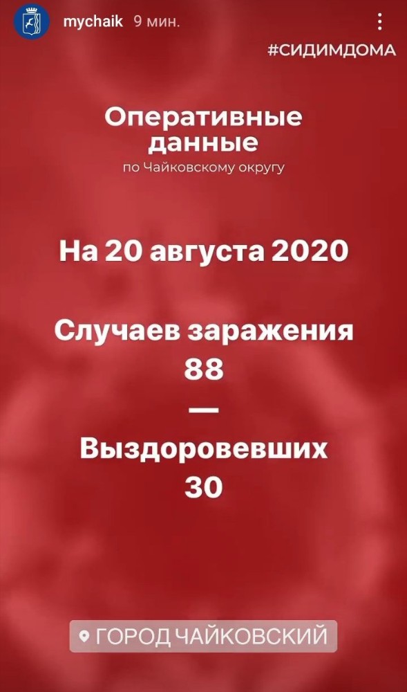 По данным пресс-службы администрации ЧГО, на четверг 20 августа общее число подтверждённых случаев заболевания COVID -19 в Чайковском округе увеличилось до 88 человек, т.е. за прошедшие сутки выявлено ещё четыре новых случая заражения. Число выздоровевших, по данным мэрии, не изменилось, от болезни оправилось 30 человек.
