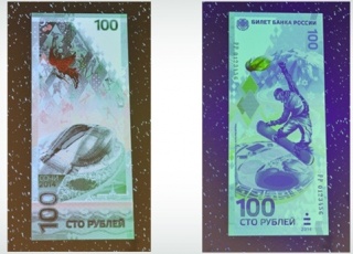 Необычные купюры были выпущены специально к зимним Олимпийским играм в Сочи. Стоит отметить, что на привычные используемые в обороте 100-рублевые банкноты они совсем не похожи, их отличает собственная цветовая гамма, рисунок и вертикальное расположение элементов.