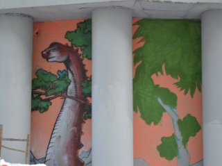 В настоящее время художники уже нанесли часть изображения. Буквально на глазах унылая серая стена площадью в 500 квадратных метров начала превращаться в удивительный мир, в котором обитают динозавры. По завершению проекта, на стене «поселятся» четыре древних ящера: цератозавр, брахиозавр, трицератопс и тираннозавр. Закончить нанесение рисунка художники планируют на следующей неделе.