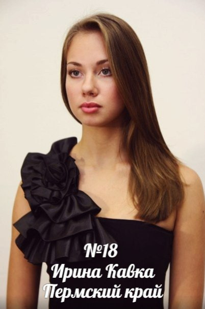 19-летняя Ирина Кавка из ПГГПУ представляла наш Пермский край. Ранее она заняла 1-ое место на конкурсе «Мисс Студенчество» в Перми. Где она откровенно призналась: «О том, что я прошла в финал мне сказали в августе, с этого момента и начала готовиться. Денег на конкурс я не тратила особо — платья нам давали в аренду, прически и макияж делали спонсоры конкурса, мои только — костюм для танго и джинсы».